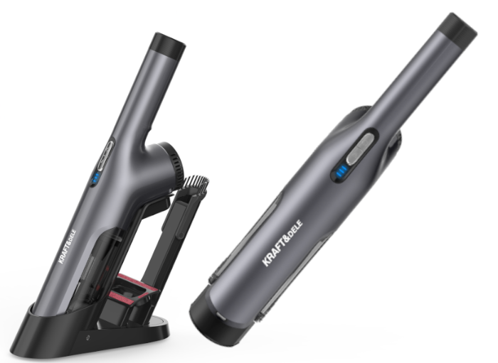 Aspirator de mână fără fir de la Kraft&Dele, model KD5159, conceput pentru aspirarea interioarelor auto. Funcționarea fără fir vă permite să ajungeți oriunde în vehicul sau în colțul casei dvs., fără a fi limitat de un cablu.