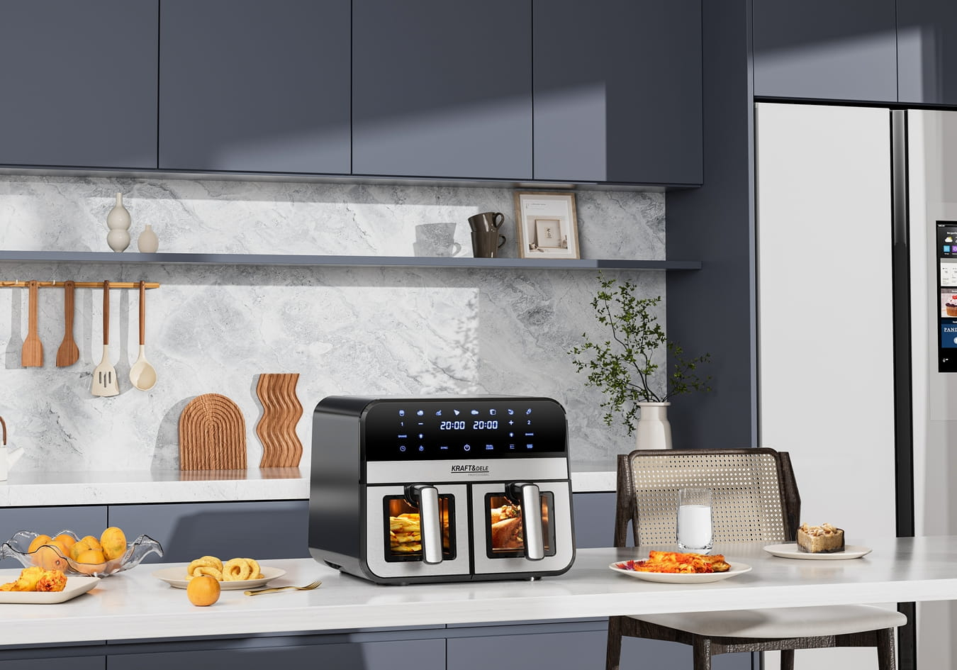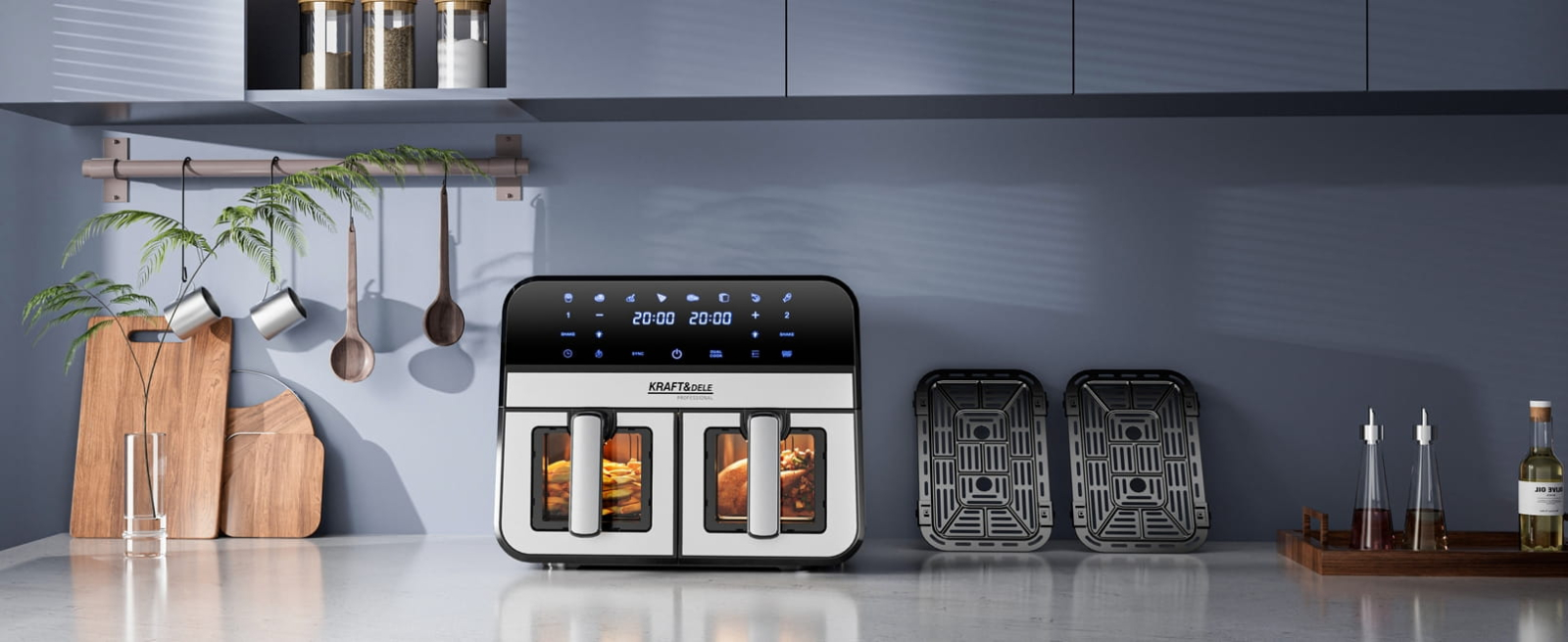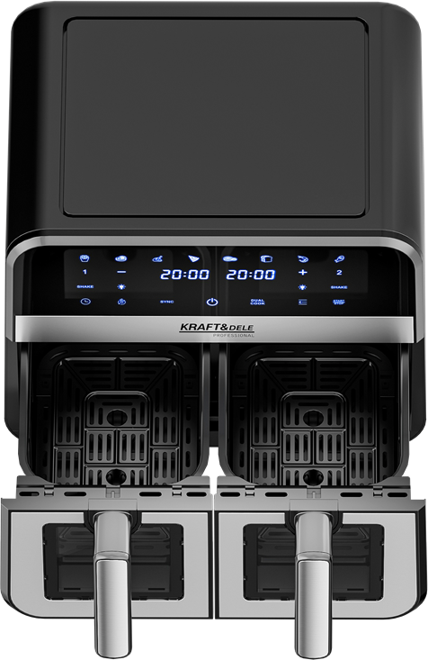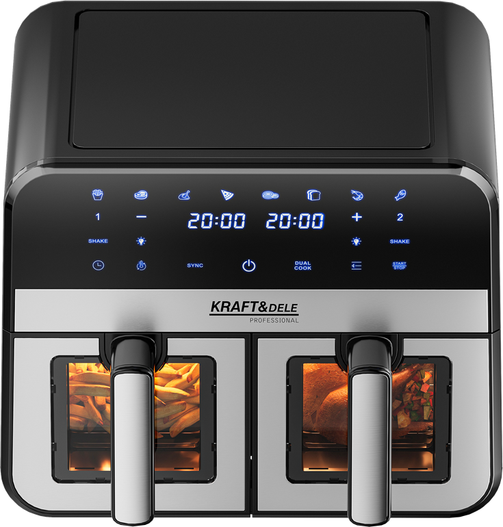 KD4179 este o friteuză modernă fără grăsimi de la KRAFT&DELE, concepută pentru gătit sănătos și rapid pentru întreaga familie. Echipată cu două coșuri separate cu ferestre de vizualizare, cu o capacitate totală de 9 litri, vă permite să preparați două feluri de mâncare diferite simultan - ideală pentru cei care apreciază confortul, economisirea timpului și posibilitatea de a găti fără grăsimi inutile.