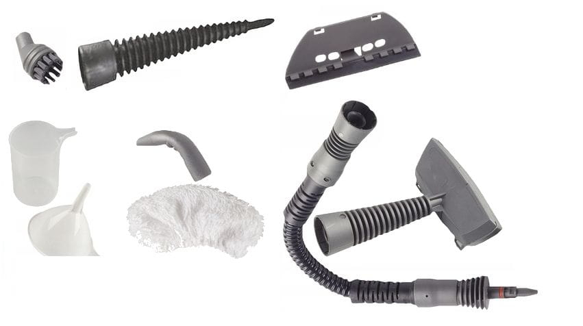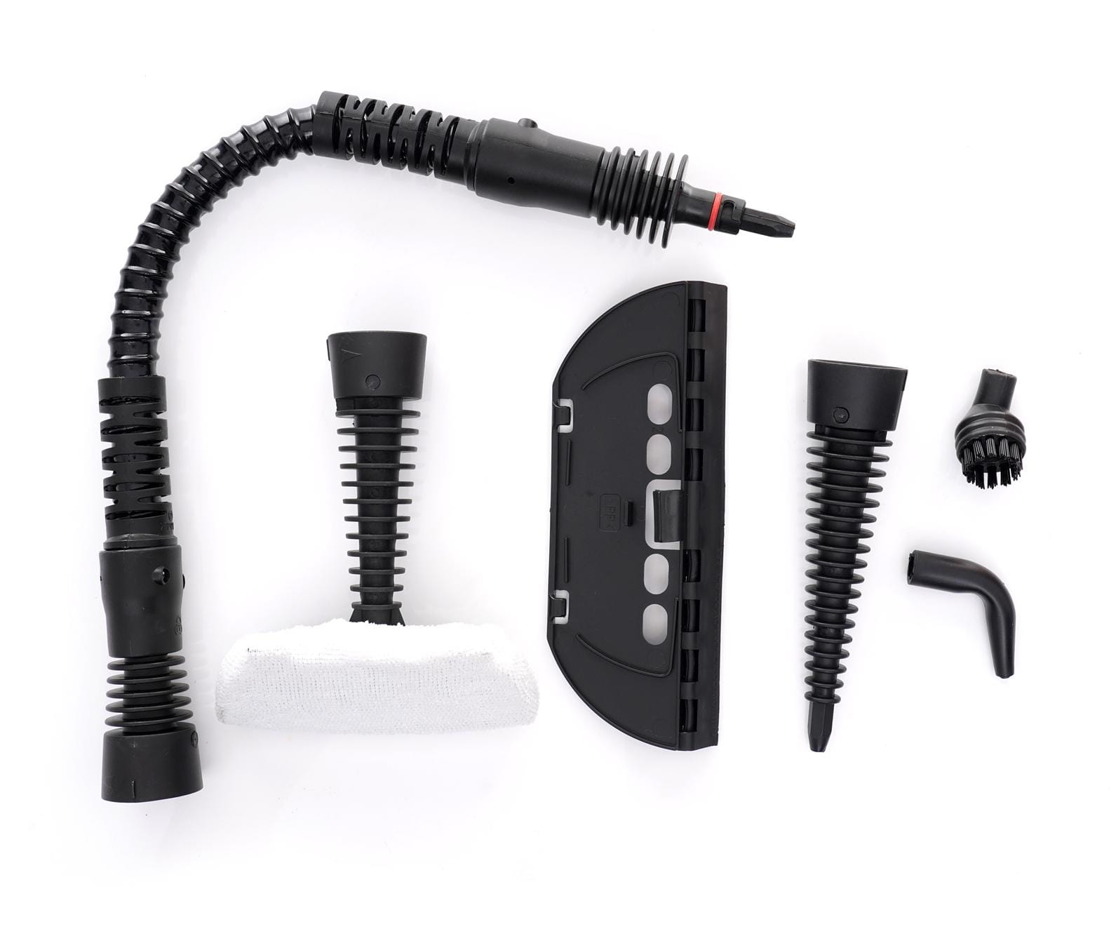 | Setul include: • Duză de pulverizare scurtă • Furtun extensibil • Pahar de măsurare • Pâlnie • Vârf rotund cu perie • Pahar de pulverizare lung • Vârf rotund cu perie • Pahar de pulverizare curbat • Manșon pentru aburitor de țesături • Accesoriu de curățare a geamurilor • Manual de utilizare |